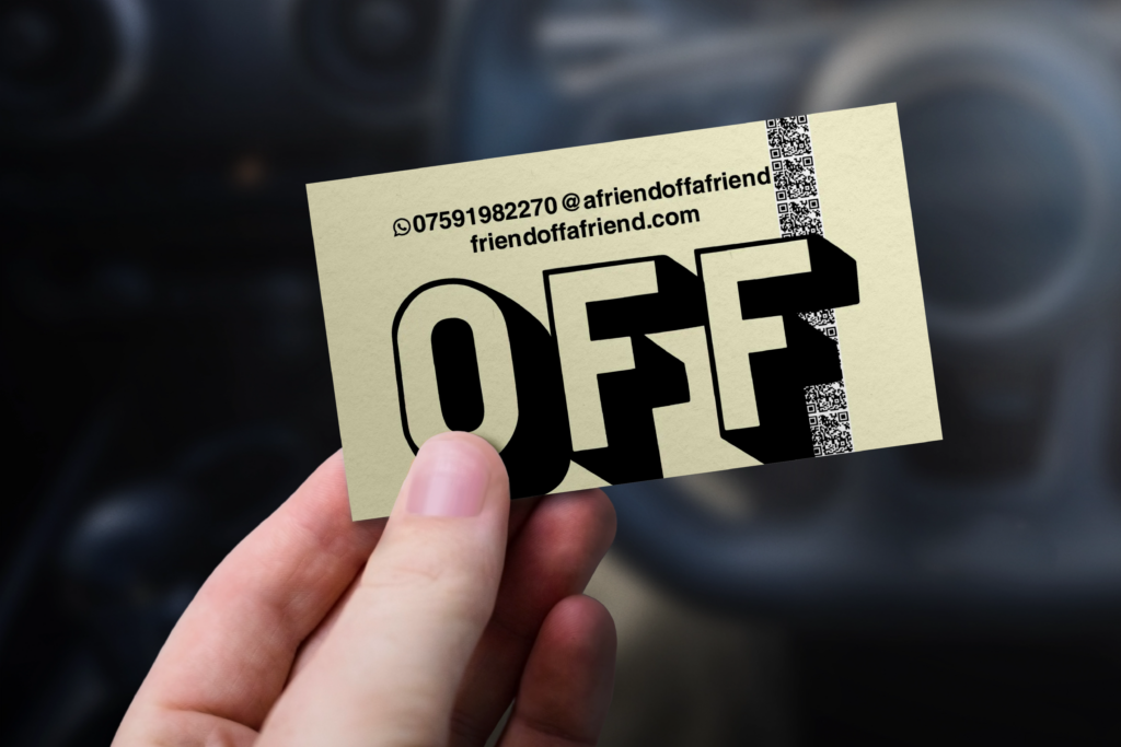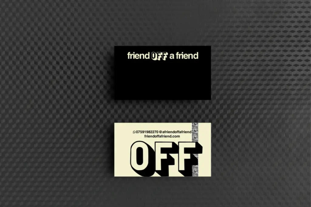 The business card design is bold, functional, and perfectly aligned with the brand’s identity. The front is clean, featuring the full name against a black background, projecting professionalism while retaining an alternative edge. The reverse side, dominated by the iconic “OFF” graphic, serves as a strong visual stamp. The vertically placed QR code integrates seamlessly without disrupting the composition.